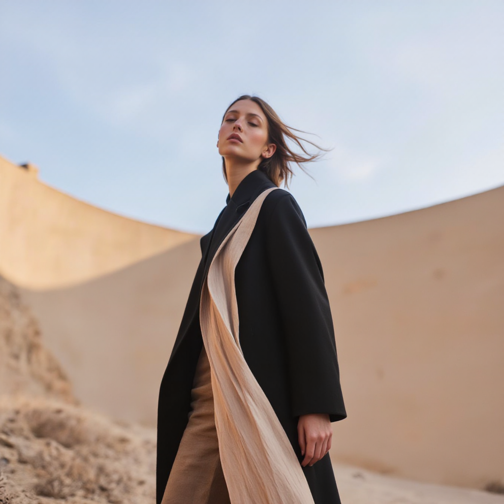 For clothing design: “architectural silhouettes, structured minimalism, origami-inspired folds, geometric draping, sculptural fashion, sharp angular tailoring, monochrome aesthetic”